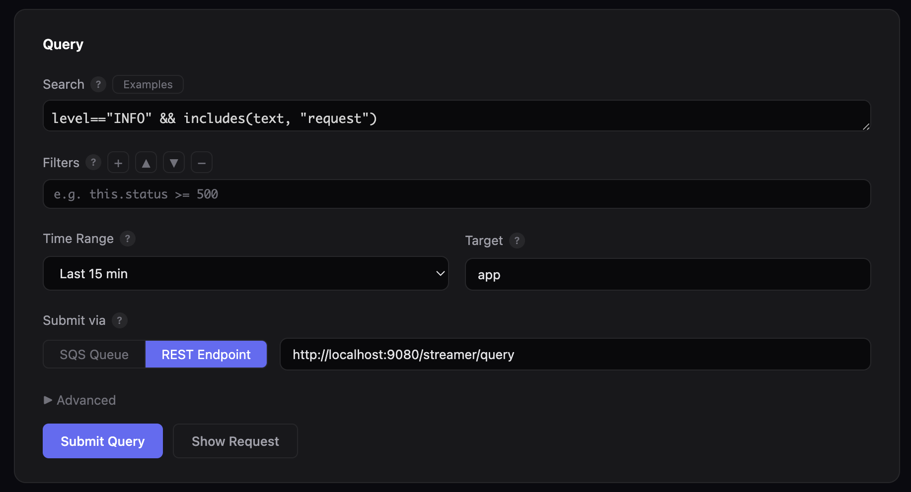 String | Search expression using enriched field names (e.g., severity_level, http_code, k8s_namespace). Must use enriched fields, NOT raw JSON fields like stream, log, or docker. See Sample Queries for working examples. Supports &&, ||, ==, and includes(). |