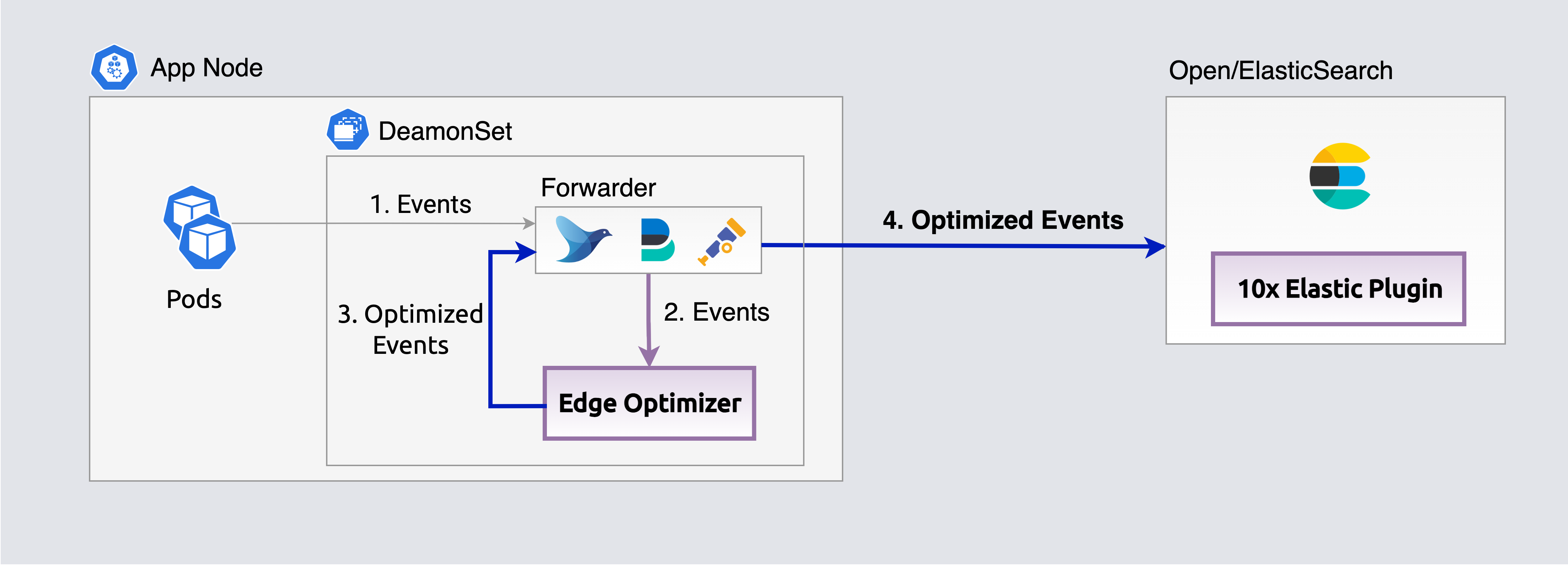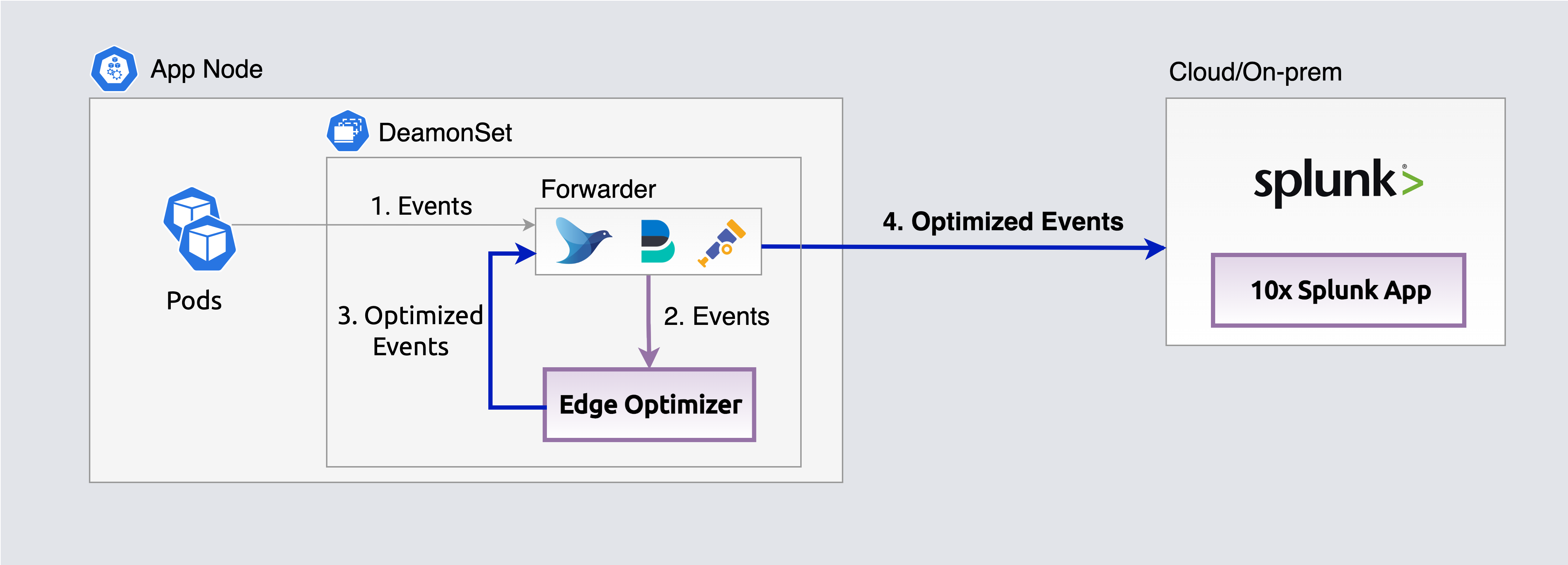 Edge optimizers execute as a forwarder sidecar process to optimize events before they ship to log analyzer or Object Storage.